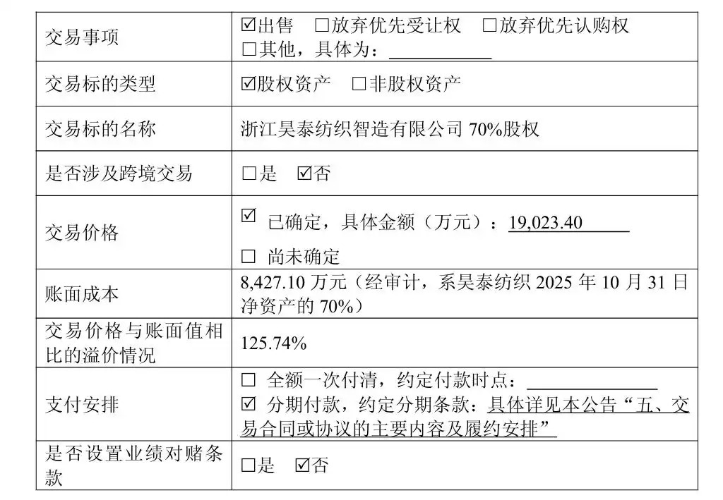 日前,盛泰集团(605138)公告称,公司全资子公司嵊州盛泰真挚有限公司(以下简称“盛泰真挚”)拟将其握有的全资子公司浙江昊泰纺织智造有限公司(以下简称“昊泰纺织”)70%股权出售给宁波昊泰企业贬责研究有限公司(以下简称“宁波昊泰”)。